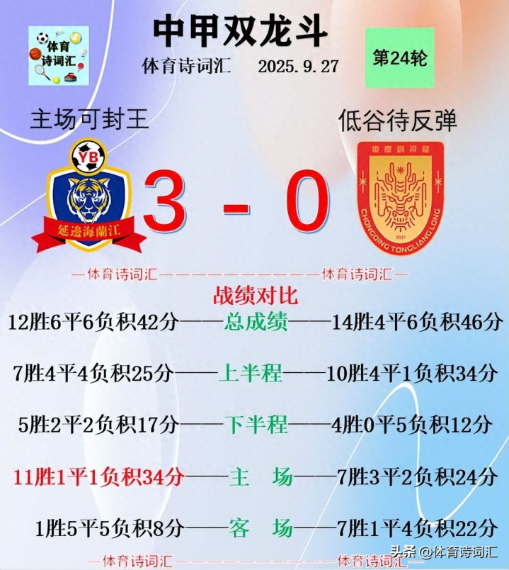赛后,双龙大战结束,铜梁龙客场不敌龙鼎遭遇三连败,最近5场仅仅1胜4负,积分停留在46分,此前10分的优势仅剩3分,张外龙首秀告负。而延边获胜后积42分,与少赛一场积43分的广东广州豹都看到了冲超逆袭的的希望。
